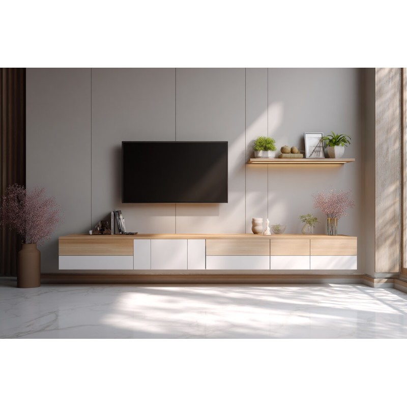 Smart and functional, this wall-mounted TV unit maximises vertical space while keeping the floor clear, making it ideal for compact or minimalist living rooms. The design features four seamlessly integrated drawers that discreetly store remotes, wires, or media devices, promoting a clutter-free environment. Its elevated style also simplifies cleaning and allows space beneath for extra décor or furniture. The clean lines and unfussy structure ensure it does not overpower the room. Whether styled with floating shelves or left as a standalone feature, the unit remains adaptable. It works well with both modern and industrial themes and suits renters and homeowners alike. The wall-mount feature offers an airy, spacious impression. For anyone who values tidy, smart living arrangements, this design ticks all the right boxes without requiring too much attention.