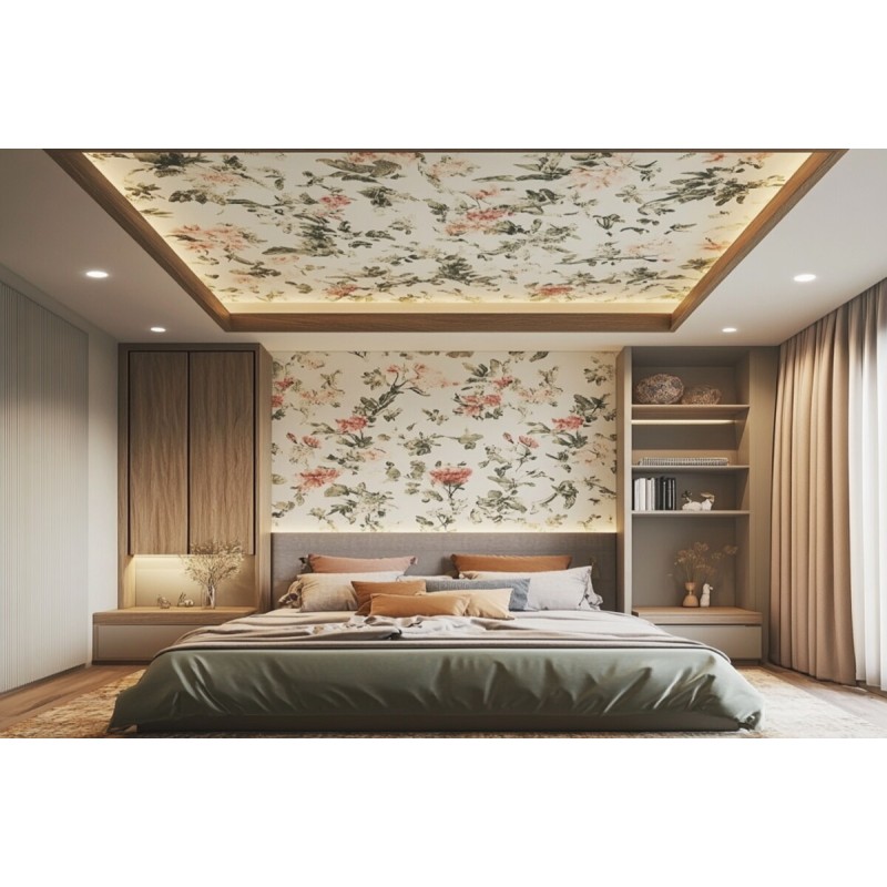 Transform your bedroom into a serene retreat with our modern floral false ceiling and wallpaper design. Blending natural charm with contemporary style, it offers a soothing, organic vibe. Crafted with durable gypsum and premium washable wallpaper, it’s a timeless choice that stays beautiful with minimal upkeep.