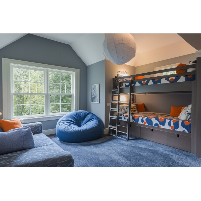 Sunlight streams through a wide window framed in white, opening to a view of soft greenery outside. Beneath it, a plush blue bean bag invites quiet reading moments beside a low grey sofa accented with sky-blue cushions and a single pop of orange. On the opposite wall, a matte grey bunk bed stands tall — its clean lines softened by built-in drawers and a sturdy ladder. Both bunks are dressed in crisp geometric bedding that weaves together blue, white, and orange hues.