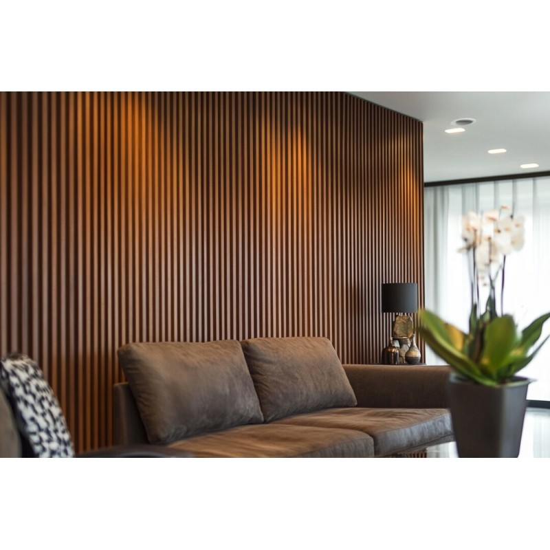 Modern Living Room Wall Design With Brown Wooden Fluted Panels