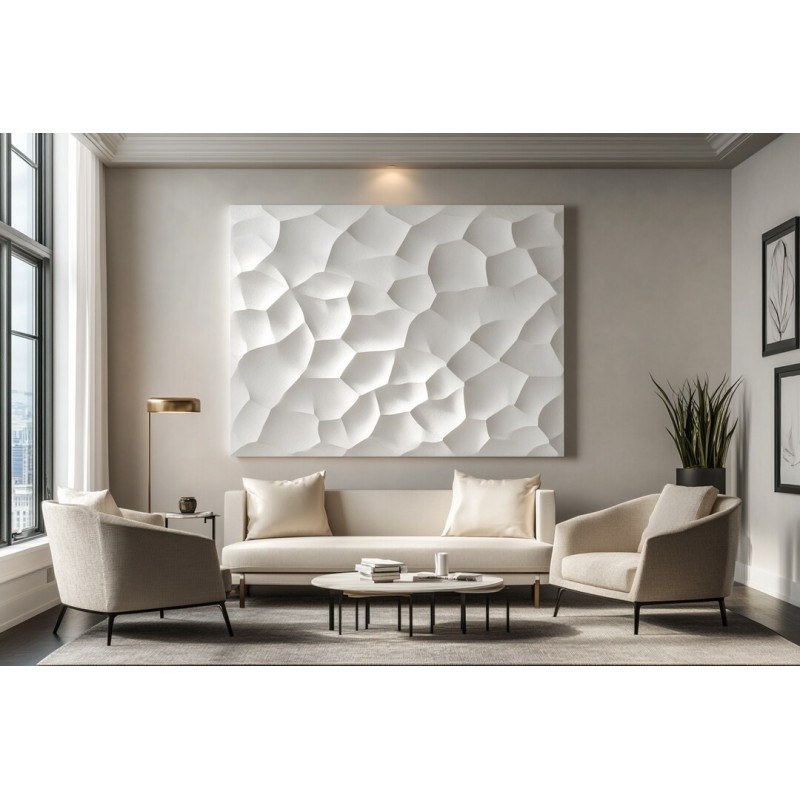 This living room showcases modern sophistication through a refined monochromatic palette and a captivating 3D wall feature.The textured surface serves as a bold focal point, adding depth and dimension to the minimalist space.Soft, neutral furnishings complement the intricate wall detail, while sleek furniture lines maintain a clean, polished look. Natural light enhances the texture, casting gentle shadows that shift throughout the day bringing the space to life.Balanced and composed, this design blends simplicity with subtle artistry creating a serene environment ideal for both quiet moments and stylish gatherings.
