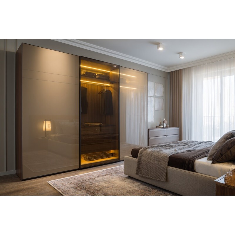 This two-door sliding wardrobe introduces rich colour and a sleek, reflective surface to the room. The dark brown lacquered glass panels offer a polished appearance that enhances light while keeping the look subtle and modern. Ideal for interiors with neutral tones or wooden accents, it helps maintain a calm, contemporary environment. The sliding mechanism saves floor space, making it perfect for compact or open-style bedrooms. Inside, it provides both hanging space and shelving to organise clothing and accessories efficiently. Designed for those who prefer a bold yet minimal aesthetic, this wardrobe pairs beautifully with warm lighting or a matching wooden bed to create a cohesive look. Its smooth surface is easy to maintain and keeps the room feeling uncluttered.