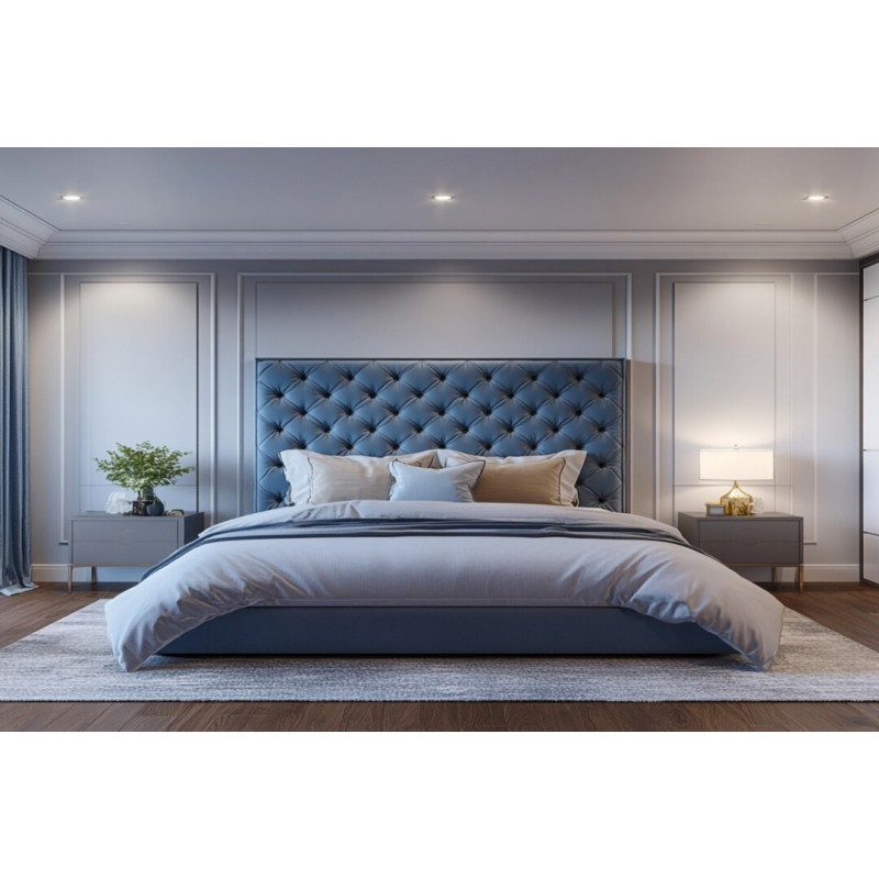 Modern Master Bedroom Design With King Bed and Blue Tufted Headboard