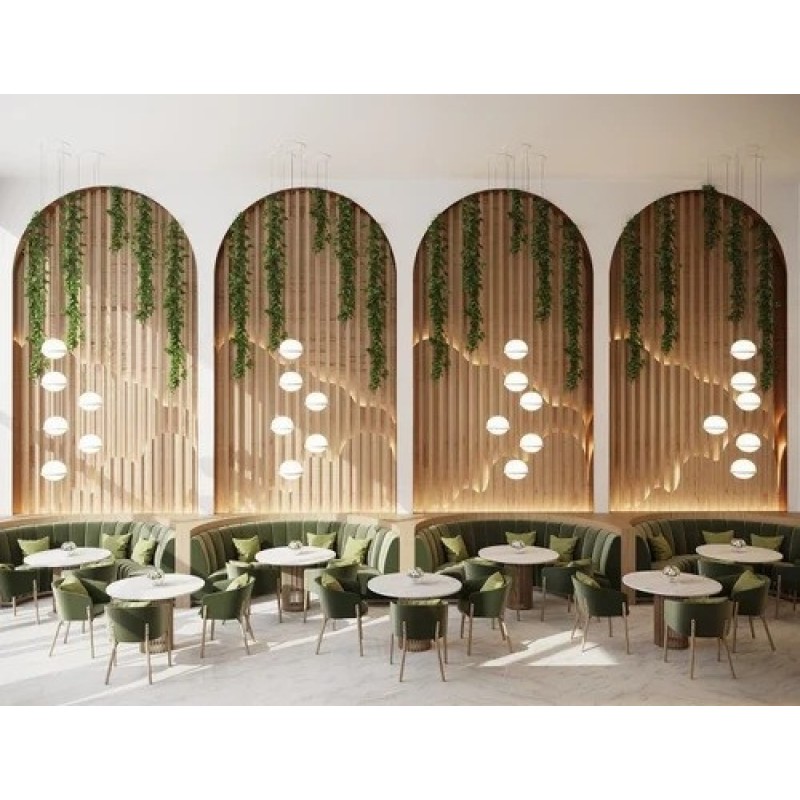 Velvet Plate Restaurant showcases a luxurious and modern interior with elegant furnishings, warm lighting, and sophisticated décor. The carefully designed layout creates an inviting and stylish dining atmosphere that enhances the overall culinary experience.