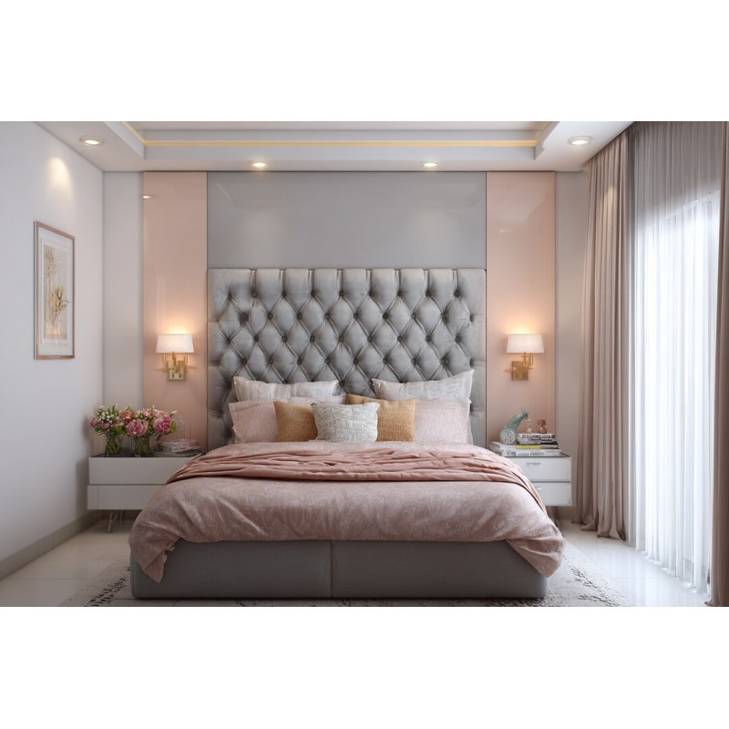 A serene blend of grey and peach creates a balanced, calming retreat. A tufted grey headboard adds texture and comfort, framed by warm peach panels and soft wall lighting. Blush and beige bedding complements the palette, while light curtains filter natural daylight. Simple flooring and layered tones complete a bright, refined space made for quiet relaxation.